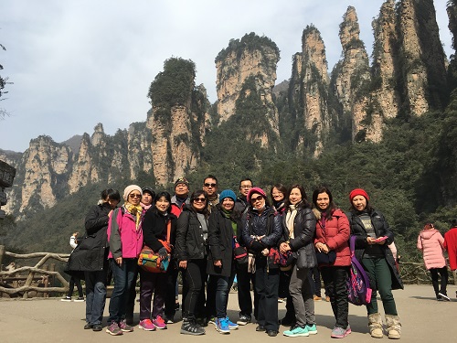 在袁家界,參觀了因阿凡達聞名於世懸浮山的原型、天下第一橋、迷魂台。大凡有橋就有同心鎖,高山的樹木上結滿了許願的紅絲帶,人心相同,祈願心想事成。世界第一梯百龍天梯平穩快速,西海峰林千姿百態,遊客在山腰間行走,山下是萬丈深淵,令人驚心動魄,讚嘆大自然的鬼斧神工。乘坐小火車觀賞三步一景、五步一絕的「十里畫廊」,給了自己一場心靈與視覺的饗宴。