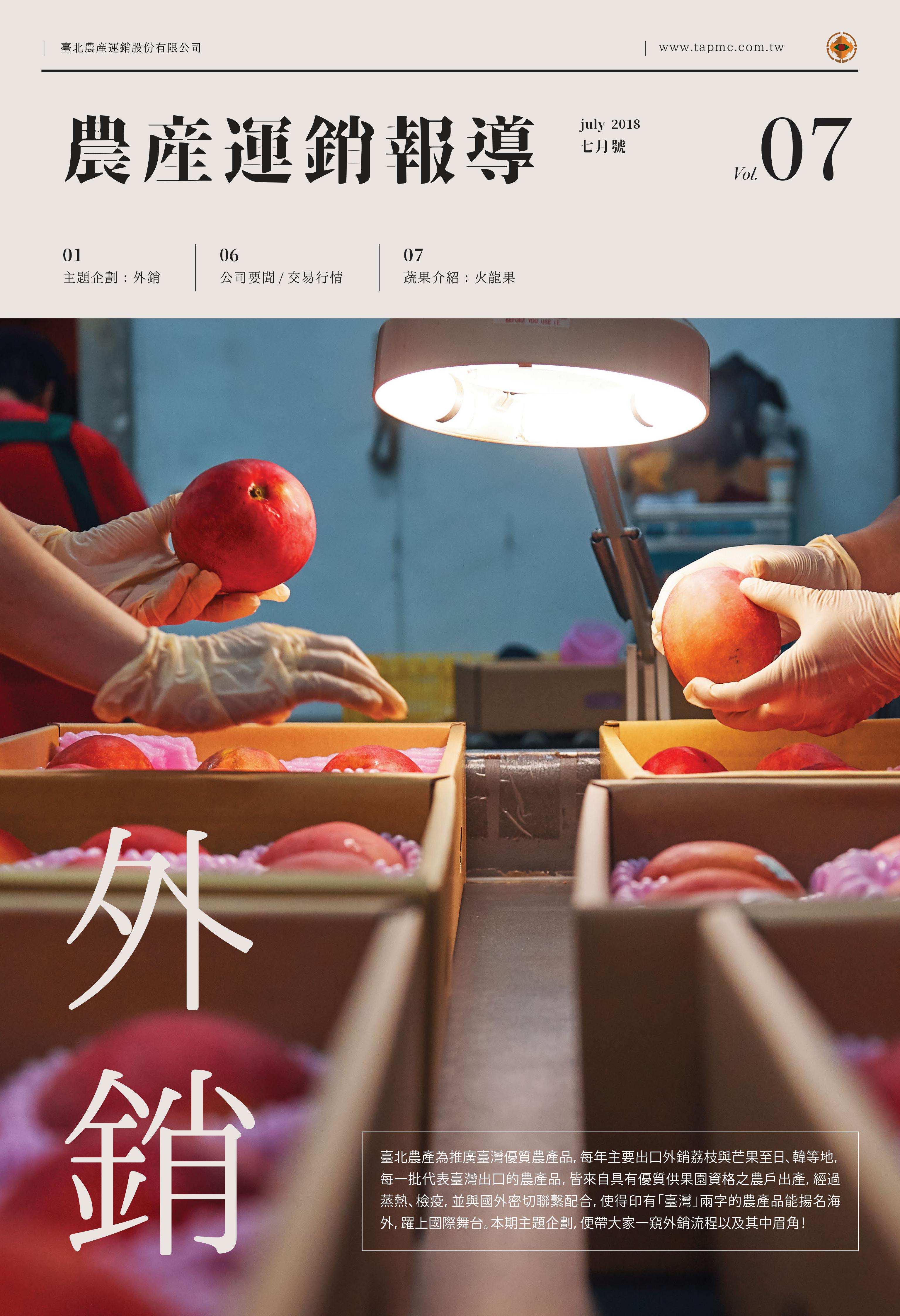 01外銷 107年07月號 文:台北農產 圖:台北農產 臺北農產為推廣臺灣優質農產品,每年主要出口外銷荔枝與芒果至日、韓等地,每一批代表臺灣出口的農產品,皆來自具有優質供果園資格之農戶出產,經過蒸熱、檢疫,並與國外密切聯繫配合,使得印有「臺灣」兩字的農產品能揚名海外,躍上國際舞台。本期主題企劃,便帶大家一窺外銷流程以及其中眉角!P01 主題企劃:外銷P06 公司要聞/交易行情P07 蔬果介紹:火龍果 相關檔案 2018_VOL7_web.pdf 2018_VOL7_web.pdf