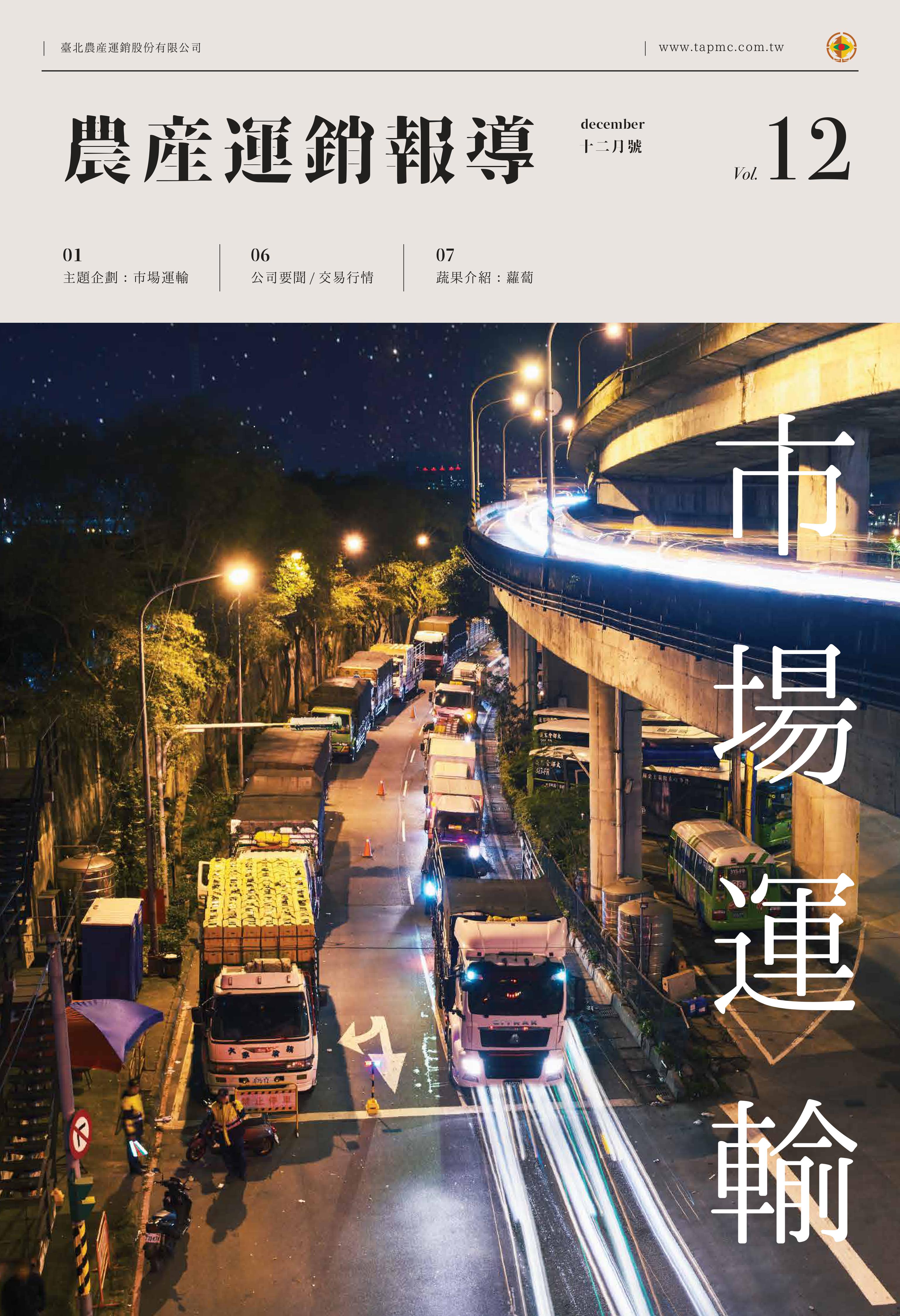 01市場運輸 107年12月號 文:台北農產 圖:台北農產 當我們在日常生活裡品嘗鮮美蔬果時,可曾想過這些蔬果是如何從產地躍上餐桌後,仍如剛採收般的完美無暇呢?其實,新鮮的背後有著龐大的「交通運輸」系統,日以繼夜地不停運轉,將農友的心血安穩迅速地送上我們的餐桌。 P1主題企劃:市場運輸P6公司要聞/交易行情P7蔬果介紹:蘿蔔 相關檔案 農產運銷報導_2018_VOL12_web.pdf 農產運銷報導_2018_VOL12_web.pdf